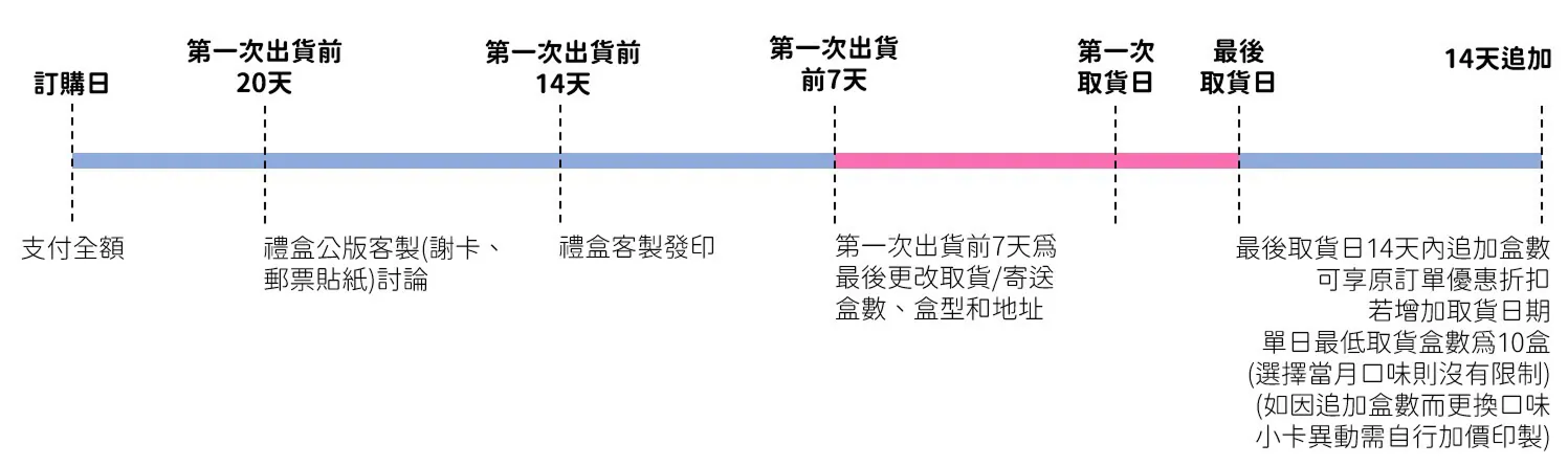 • 若您於最後取貨日的14天內追加,如更換口味小卡異動,需自行加價印製